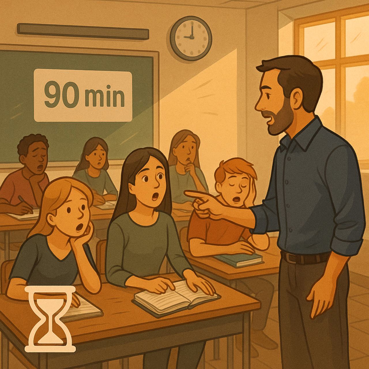 On the flipside, the longest class length I had was two 50 minute blocks with a 10 minute break2. This was great for student learning on most activities, but at times I could see students flagging. In general the longer the class the more downward pressure on the student. If a student had a poor sleep or didn't eat, or didn't do the reading it really starts to show in the longer class times in most teaching formats. Similarly, the longer the class duration, the more likely the student is called on by the teacher or forced to speak in a group and demonstrate to everyone their knowledge of the topic (or lack thereof).